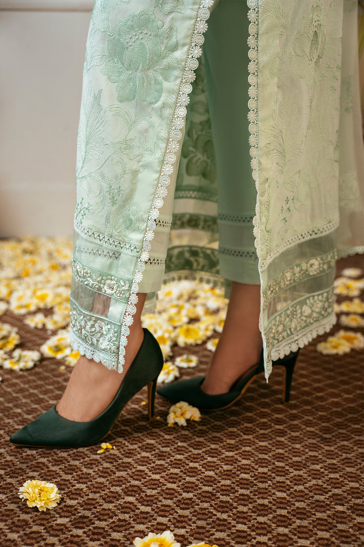 The lawn shirt, adorned with breeza embroidery and delicate organza borders. Cambric culottes create a graceful silhouette, complemented by pure bamber chiffon dupatta, intricately embroidered, adds a touch of ethereal sophistication. With its fusion of artisanal embroidery, rich textures, and contemporary tailoring, this is a true statement of understated opulence.