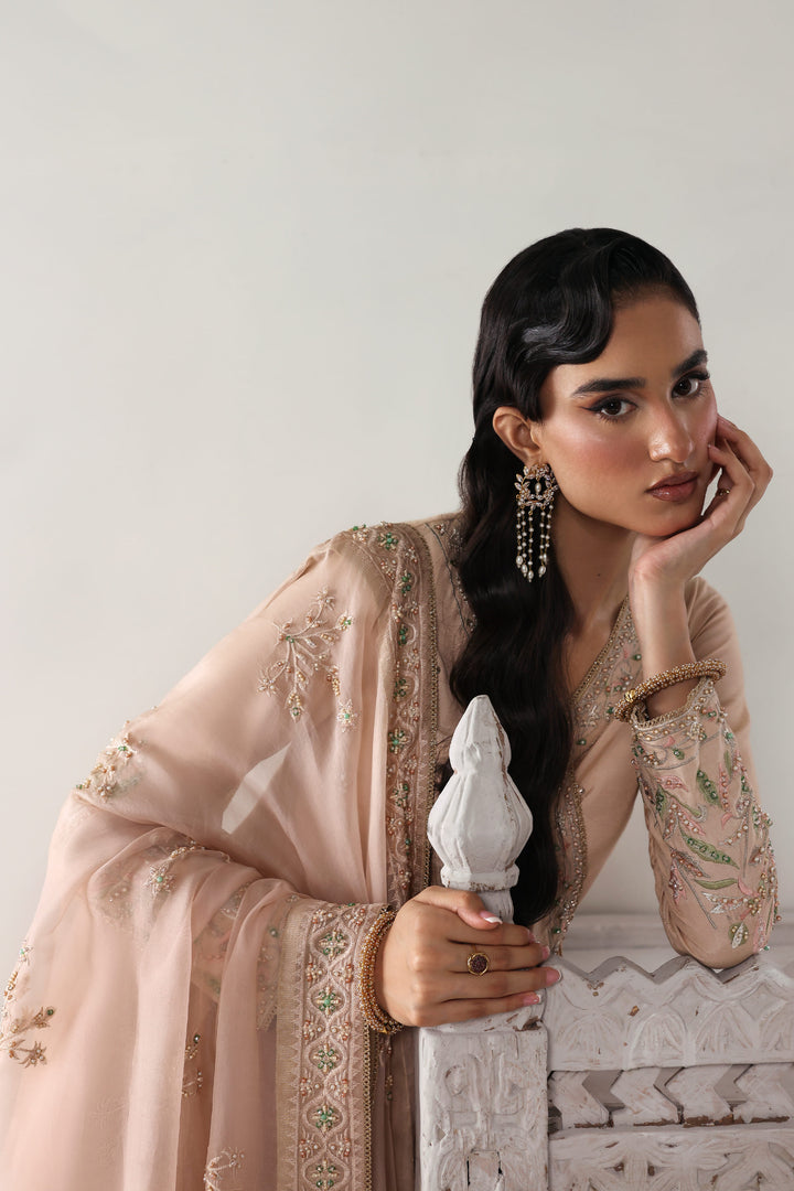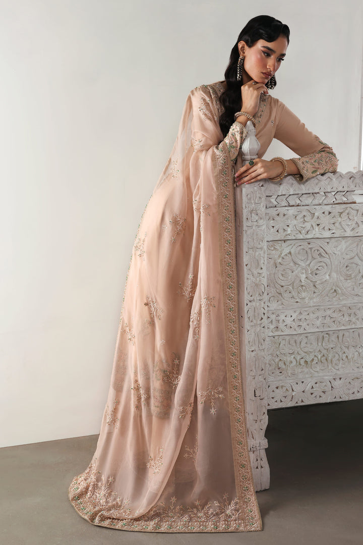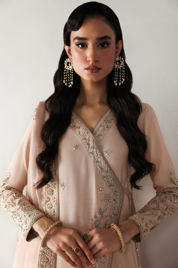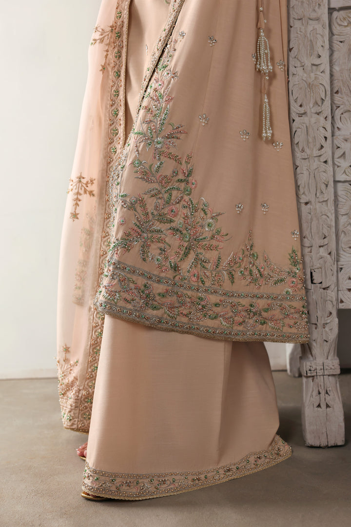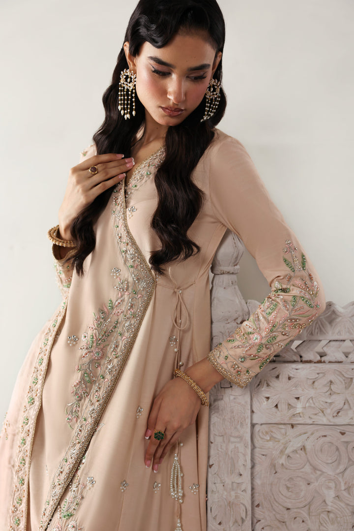 Ethereal and refined, Celene captures the romance of tradition reimagined through modern couture. The blush pink tussle silk anghrakha, enriched with intricate embroidery and delicate tassel accents, reflects the beauty of detailed craftsmanship. Flowing palazzo pants with a hand-embellished border add depth and structure to the silhouette. The organza dupatta, glimmering with sequins, beads, and diamantés, lends a radiant finish. A perfect symphony of elegance and charme, it embodies understated grandeur with contemporary finesse.