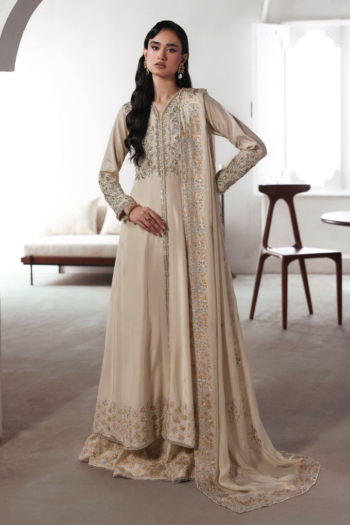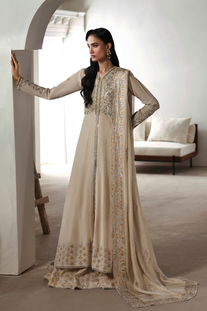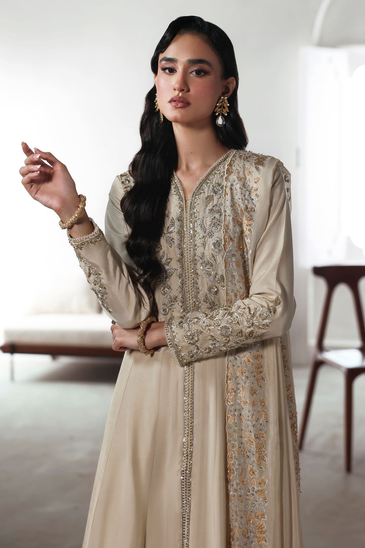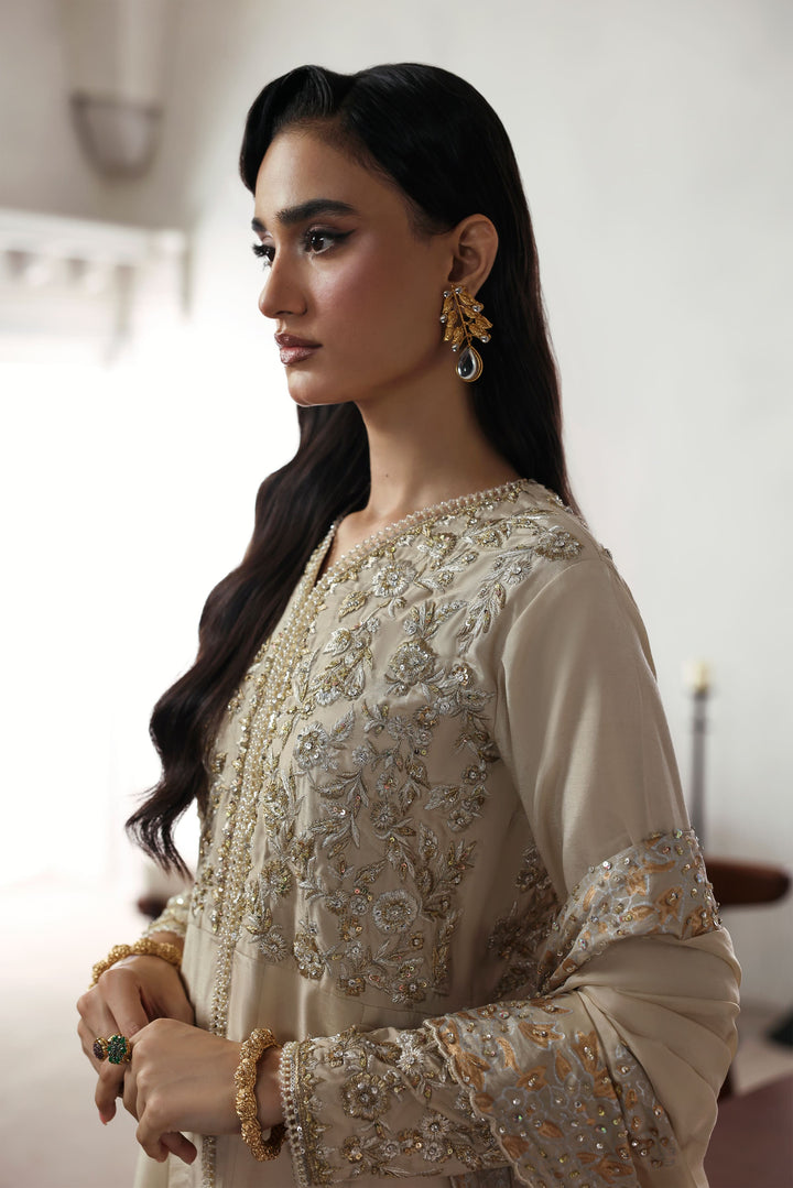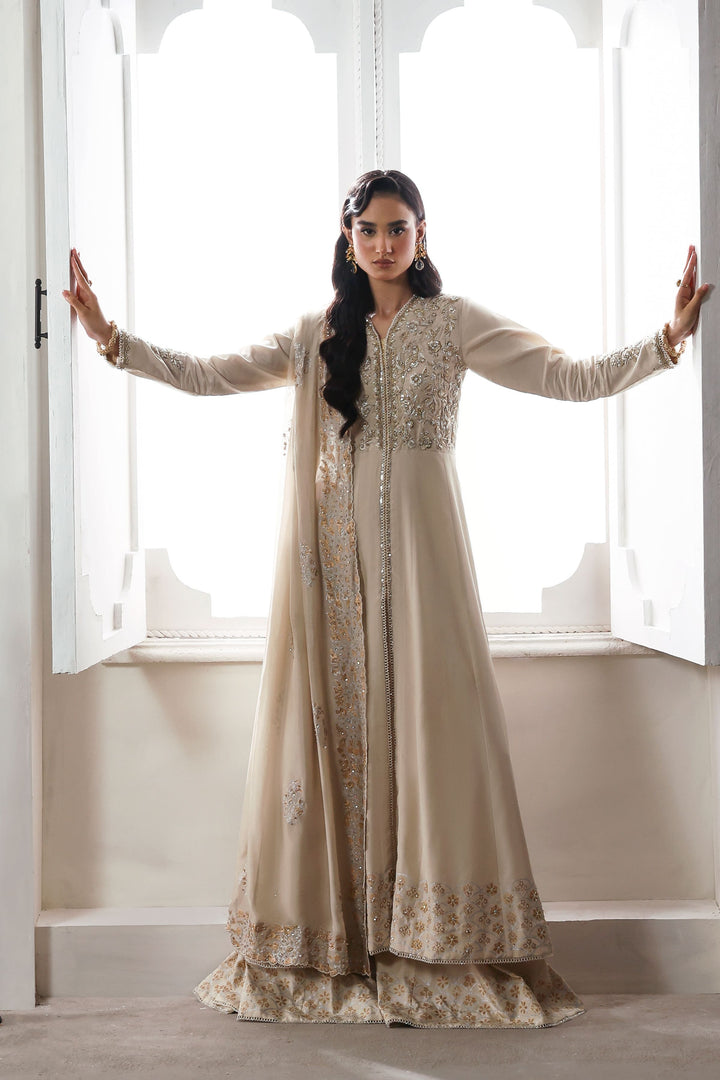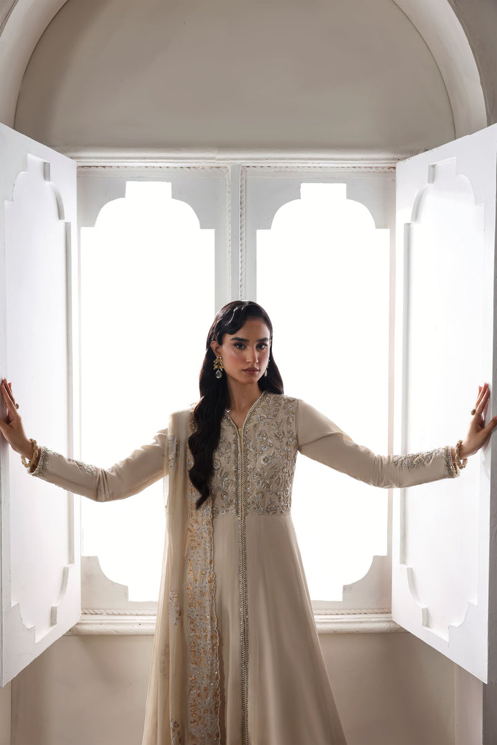 A tribute to ethereal beauty, Halo in ivory radiates an aura of classic allure. The tussle silk pishwas, hand-embroidered with dabka, zari, sequins, stones, mukaish, and resham threads, showcases exquisite craftsmanship in every detail. Paired with a flowing lehnga accented with a hand-printed border, the silhouette reflects both tradition and grandeur. The silk dupatta, finished with block print and delicate embellishments, completes the look with luminous elegance. Infused with heritage and modern charme, this ensemble is designed to shine with celestial brilliance.