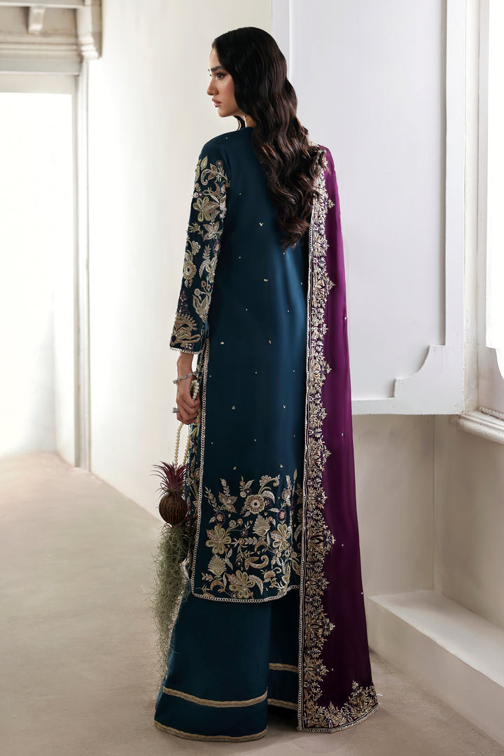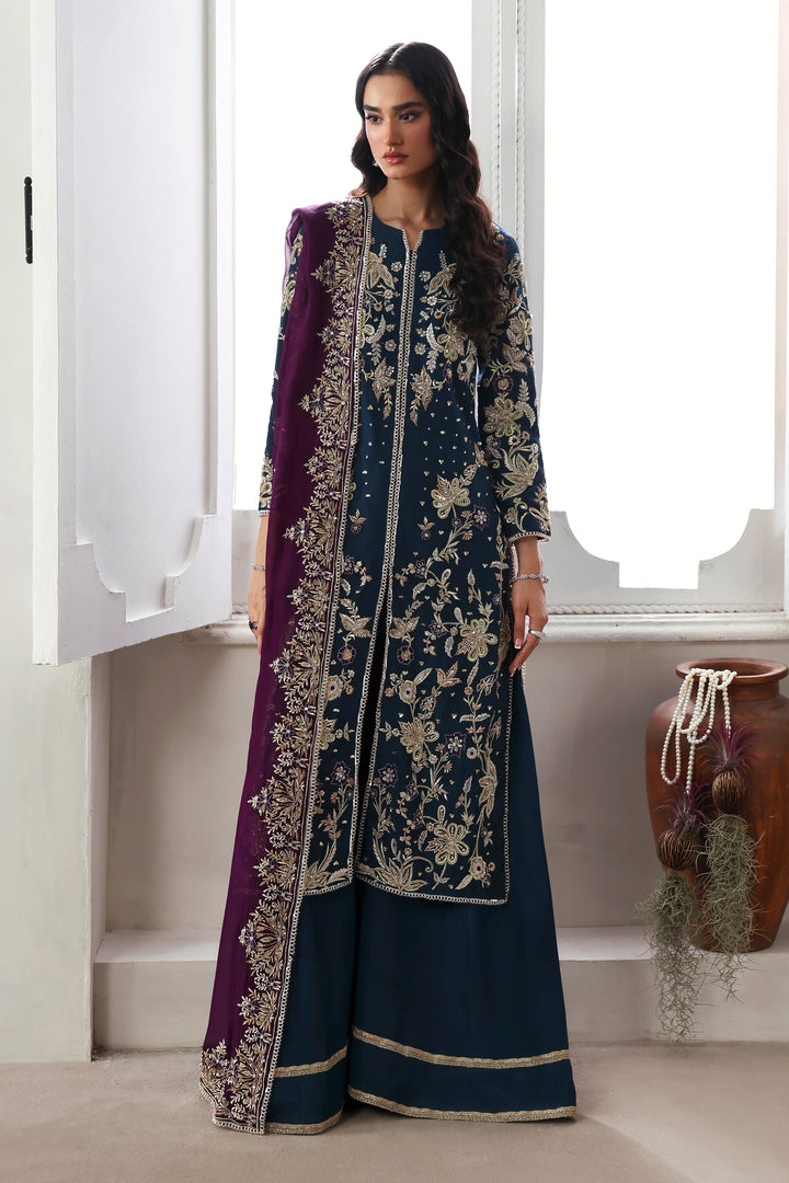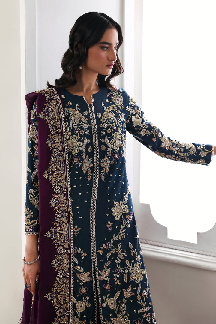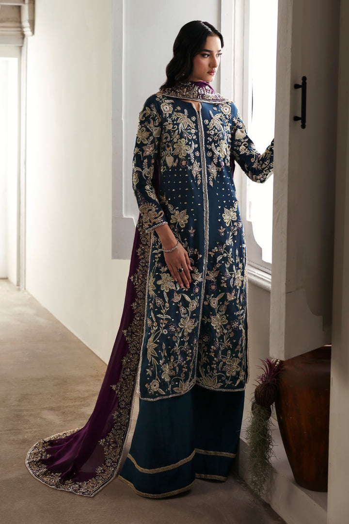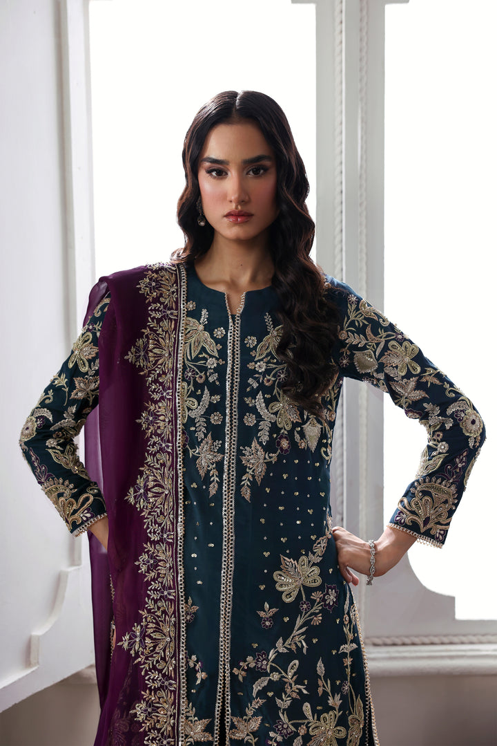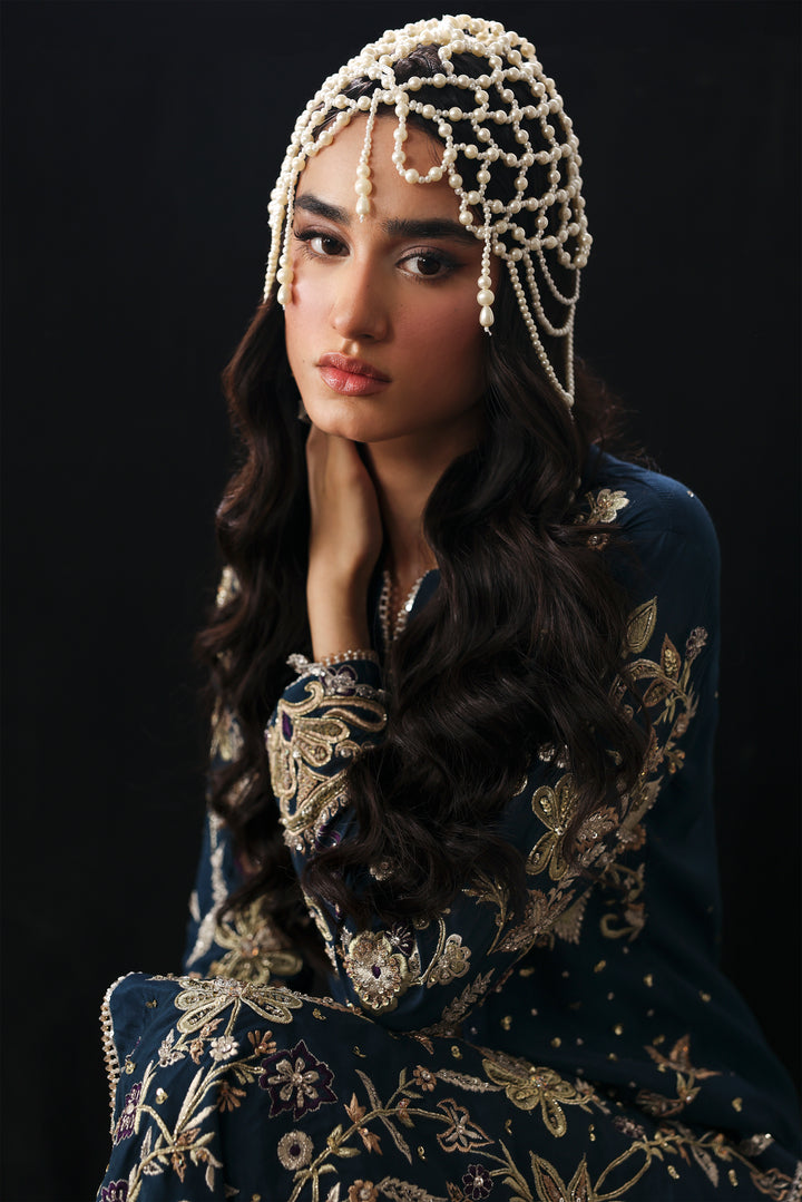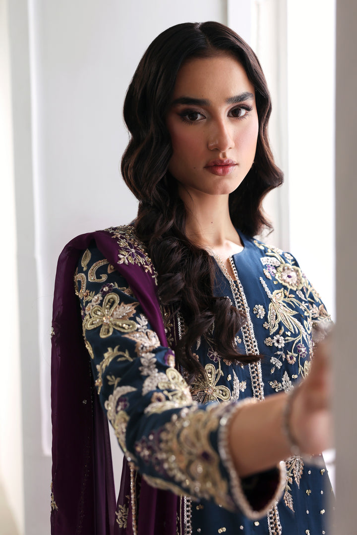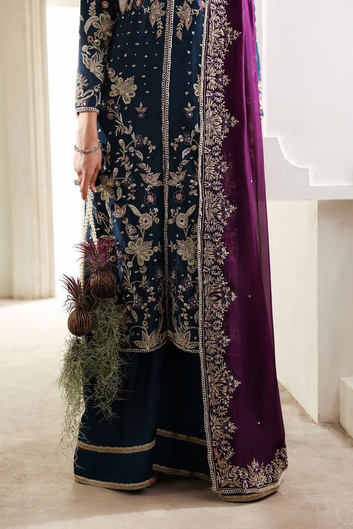 A vision of regal allure, Mystic Sea radiates refined sérénité. The navy tussel silk long shirt, delicately adorned with intricate embroidery and gleaming embellishments, is paired with a simple azar trouser, creating a seamless harmony between ornament and simplicity. The silk dupatta, framed with opulent embellishment, falls with fluid elegance — together, they form an ensemble where mystery meets magnificence.
