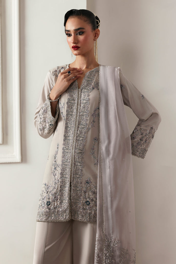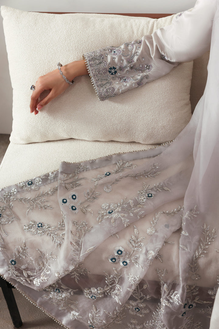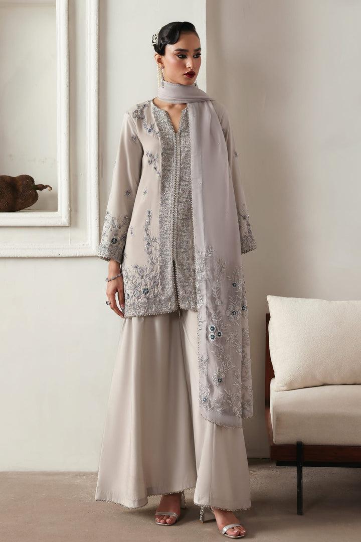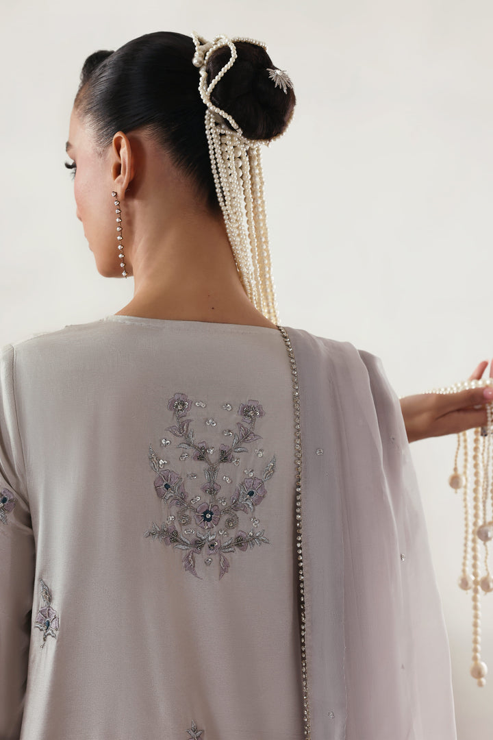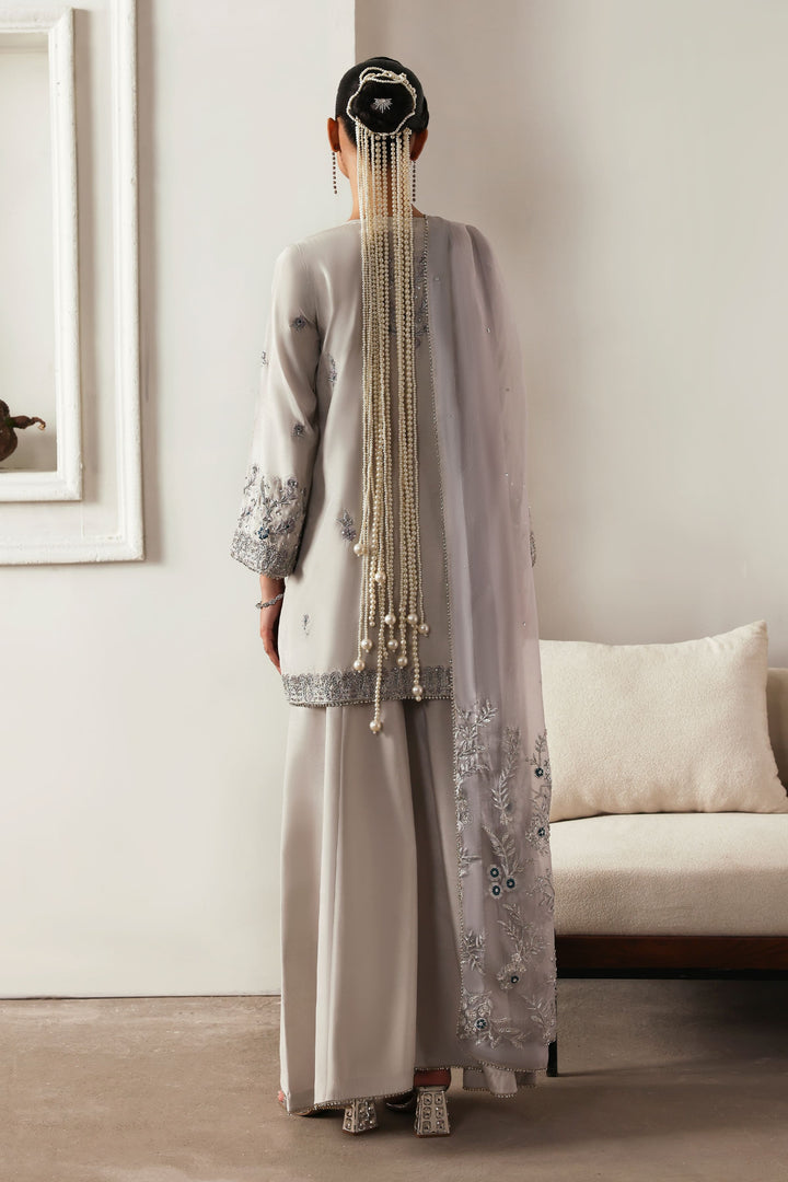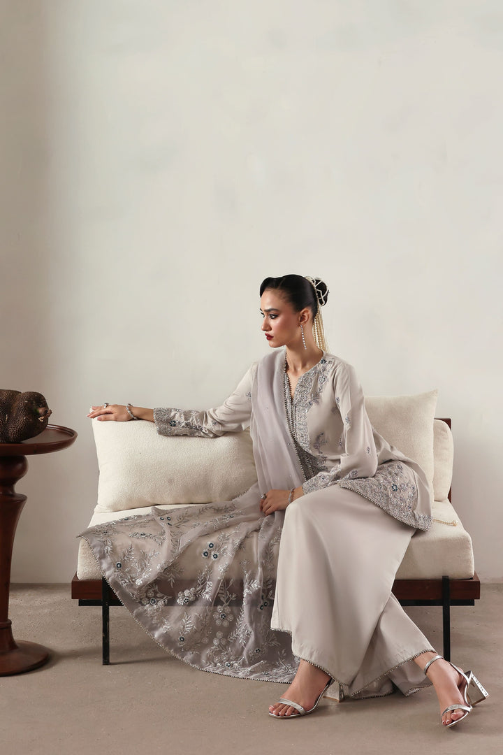 A vision of modern elegance, Nuvra in grey exudes quiet grandeur. The pure raw silk jacket, intricately embellished, flows seamlessly into a paneled sharara that lends structure and grace. Paired with an organza dupatta delicately adorned with handwork, the ensemble strikes a balance between sophistication and contemporary finesse. Crafted for the woman who moves with confidence and grace, it embodies couture élégance. A statement of power and refinement, destined to turn every glance into admiration